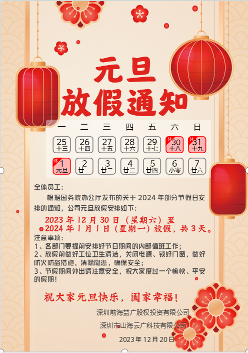 根據(jù)國務(wù)院辦公廳發(fā)布的關(guān)于2024年部分節(jié)假日安排的通知,公司元旦放假安排如下: